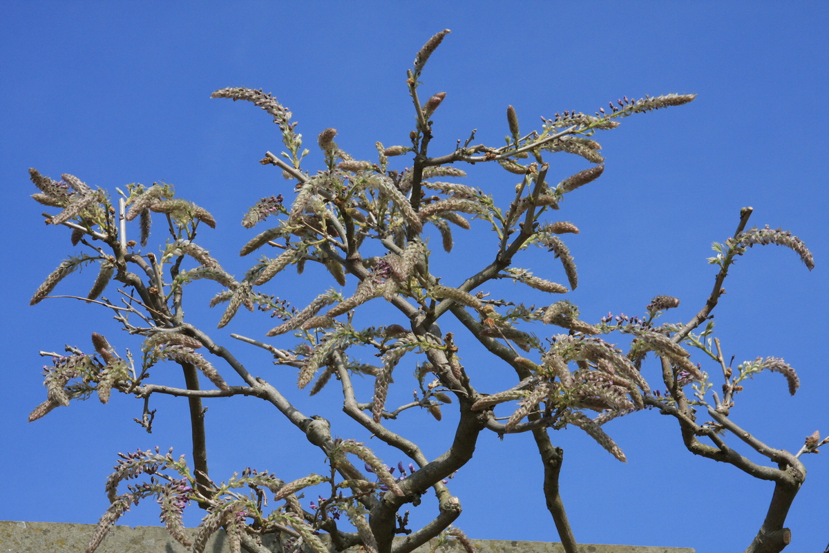 Wisteria floribunda 'Violacea Plena', has double violet-blue flowers, but not so free flowering as the single forms.