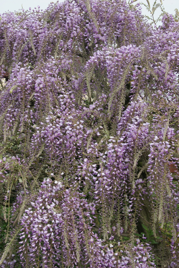 Wisteria sinensis, (W. chinensis) the most popular of the Wisteria, an extremely striking climber. Very vigourous, the twining shoots eventually reaching up to 18m, spiralling anti-clockwise as opposed to the clockwise of W.floribunda. The fragrant flowers are shades of deep lilac through to mauve. They can be 2cm long on racemes up to 30cm in length. Flowers open with the unfurling of the young foliage in a most spectacular manner, all flowers on a raceme opening together, instead of the gradually increasing display from W.floribunda.