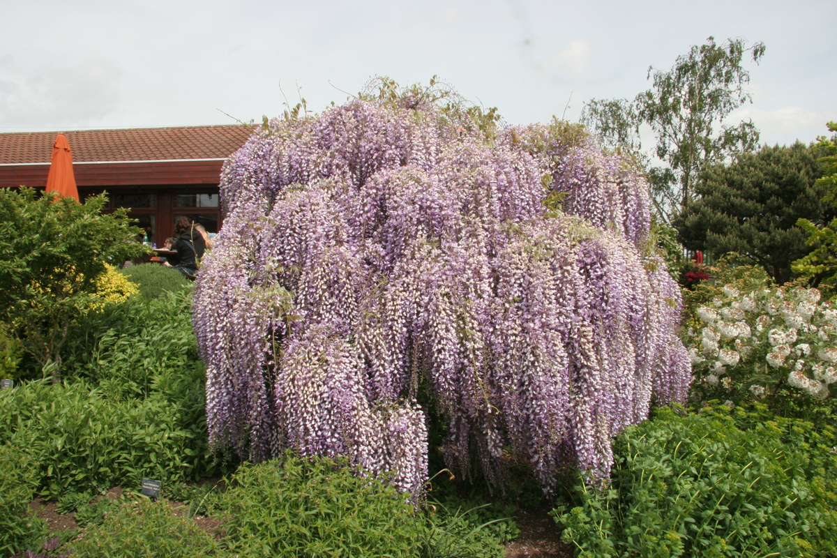 A small genus of vigorous twining shrubs. Members of Leguminosae, they are related to runner beans and Laburnum, the typically pea like flowers in shades of white, pink, blue and mauve being borne on pendant racemes between 30cm and 1 metre long. The foliage is attractively pinnate (ash like), each having 10-20 leaflets, is distinctively downy when young in some species. A deciduous genus, most species of which flower during May and June just before or as the new foliage appears. Wisteria are ideal subjects for full sun on south or west facing walls, pergolas or for climbing up into large old trees, but with attention to detail can be restrained to form a standard specimen. Although there are about ten recorded species, only two are commonly planted, there being several named forms of each. Unfortunately, propagation of these named forms is by grafting and somewhat slow and difficult, with a consequent relatively high price on the resultant desirable plants. Many outlets unfortunately supply much cheaper to produce plants from seed, which can take many years to flower, most of which will be inferior to the named forms, which have larger flowers or longer racemes of flowers. It is therefore most important that you buy a specimen in flower, or a named form from a reputable source, be wary of "cheap" offers.